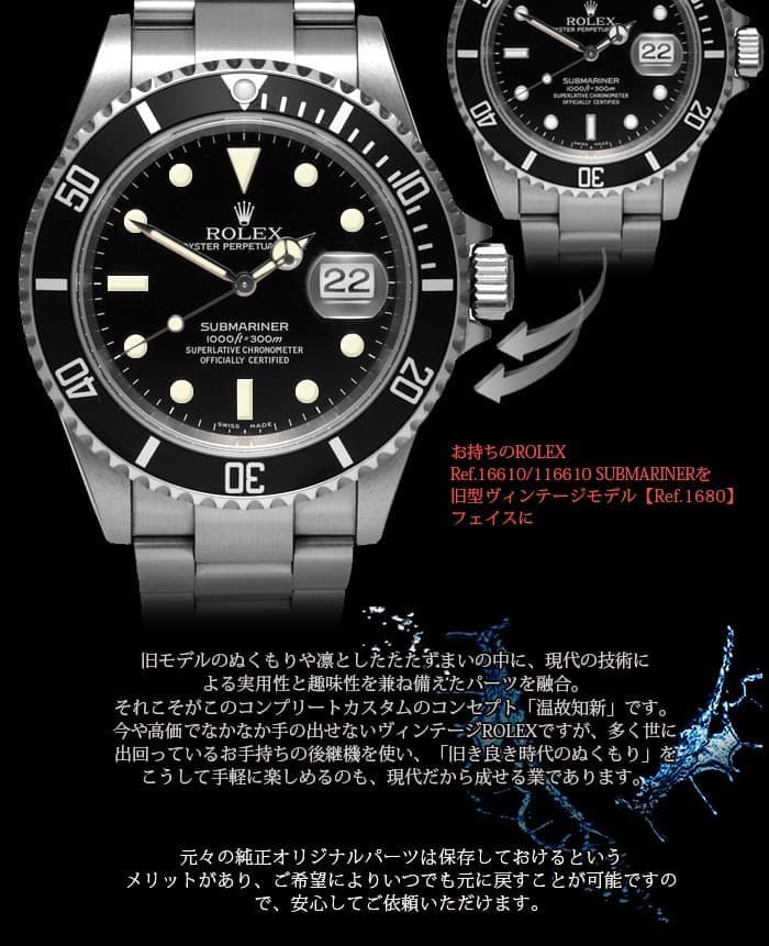 ■お持ちのRef:16610を旧型モデル【1680】ルックにする受注受付です。※完全受注加工ですので、納期は約1~2ヶ月頂戴しております。 ※時計は装着イメージです。※オプションに関してはお問い合わせください。※ダイアル・針・夜行部分への加工はオプションです。このサービスに含まれるオーバーホール作業は基本料金内でのことです。パーツ交換や修正作業などの必要性が生じた場合は追加料金が発生いたします。また、その際パーツ入荷等に時間がかかる場合がありますので納期の変動は生じる旨事前にご了承ください。(その際は見積りをご連絡いたします。)