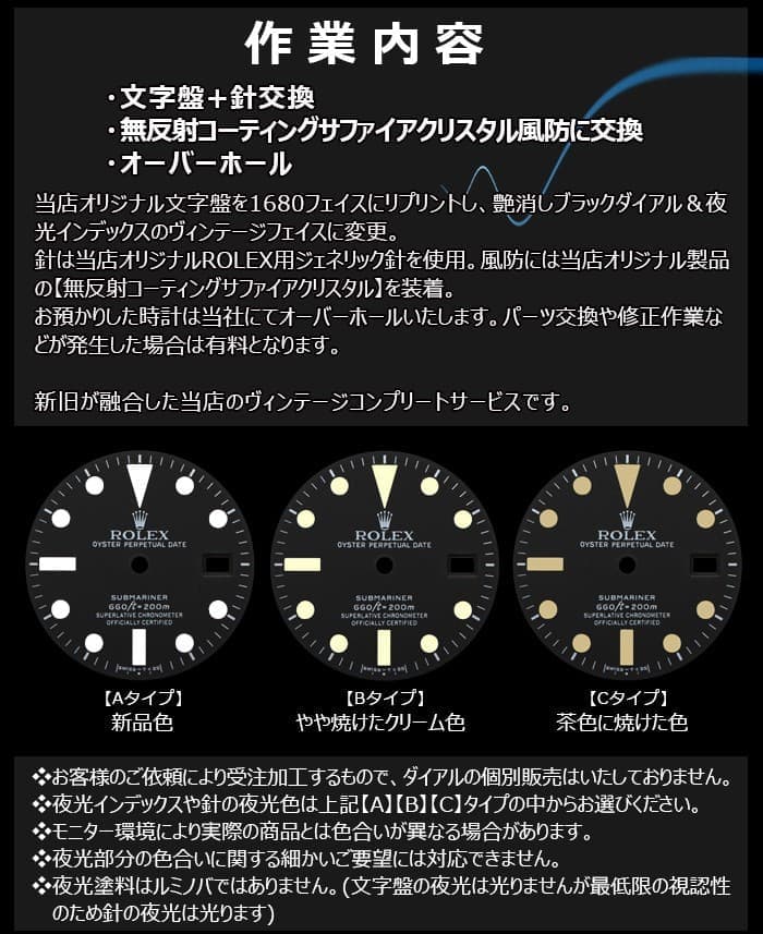 ■お持ちのRef:16610を旧型モデル【1680】ルックにする受注受付です。※完全受注加工ですので、納期は約1~2ヶ月頂戴しております。 ※時計は装着イメージです。※オプションに関してはお問い合わせください。※ダイアル・針・夜行部分への加工はオプションです。このサービスに含まれるオーバーホール作業は基本料金内でのことです。パーツ交換や修正作業などの必要性が生じた場合は追加料金が発生いたします。また、その際パーツ入荷等に時間がかかる場合がありますので納期の変動は生じる旨事前にご了承ください。(その際は見積りをご連絡いたします。)