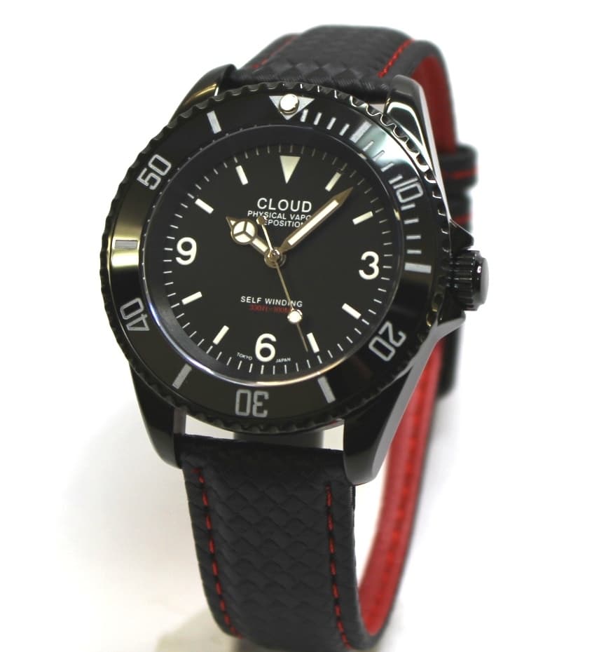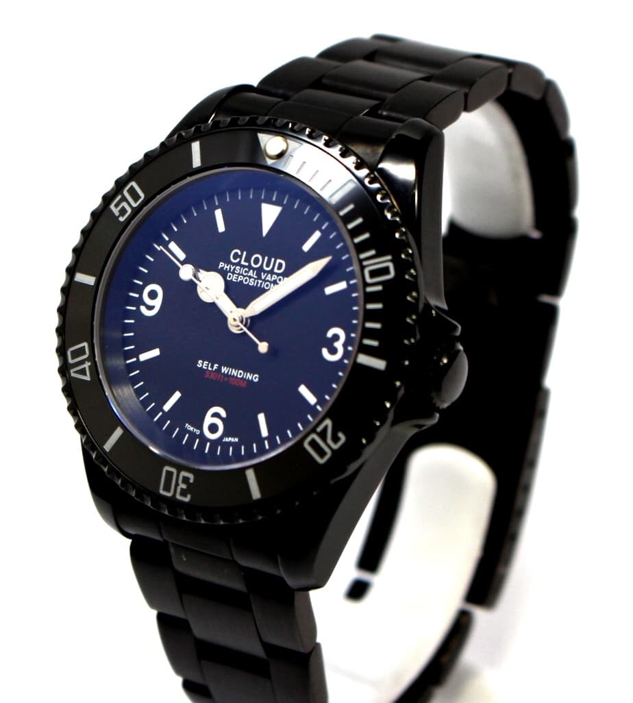PVDブラックコーティングされたステンレス製ケースにMIYOTA製オートマチックムーブメントを搭載しています。(SSブレスレットかナイロン製ストラップかをお選びいただけます。)
